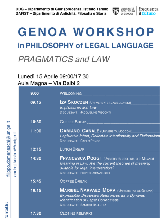 The first Genoa workshop in Philosophy of Legal Language will focus on Pragmatics and Law. It will take place at the University of Genoa next Monday, 15 April 2019. The participants include Izabella Skoczen (Jagiellonian Centre for Law, Language and Philosophy, Cracow), Francesca Poggi (University of Milan), Maribel Narvaez Mora (University of Girona), Damiano Canale (Bocconi University), Carlo Penco, Jacqueline Visconti, Sandro Balletta and Filippo Domaneschi (all from the University of Genoa). Here is the programme of the workshop: