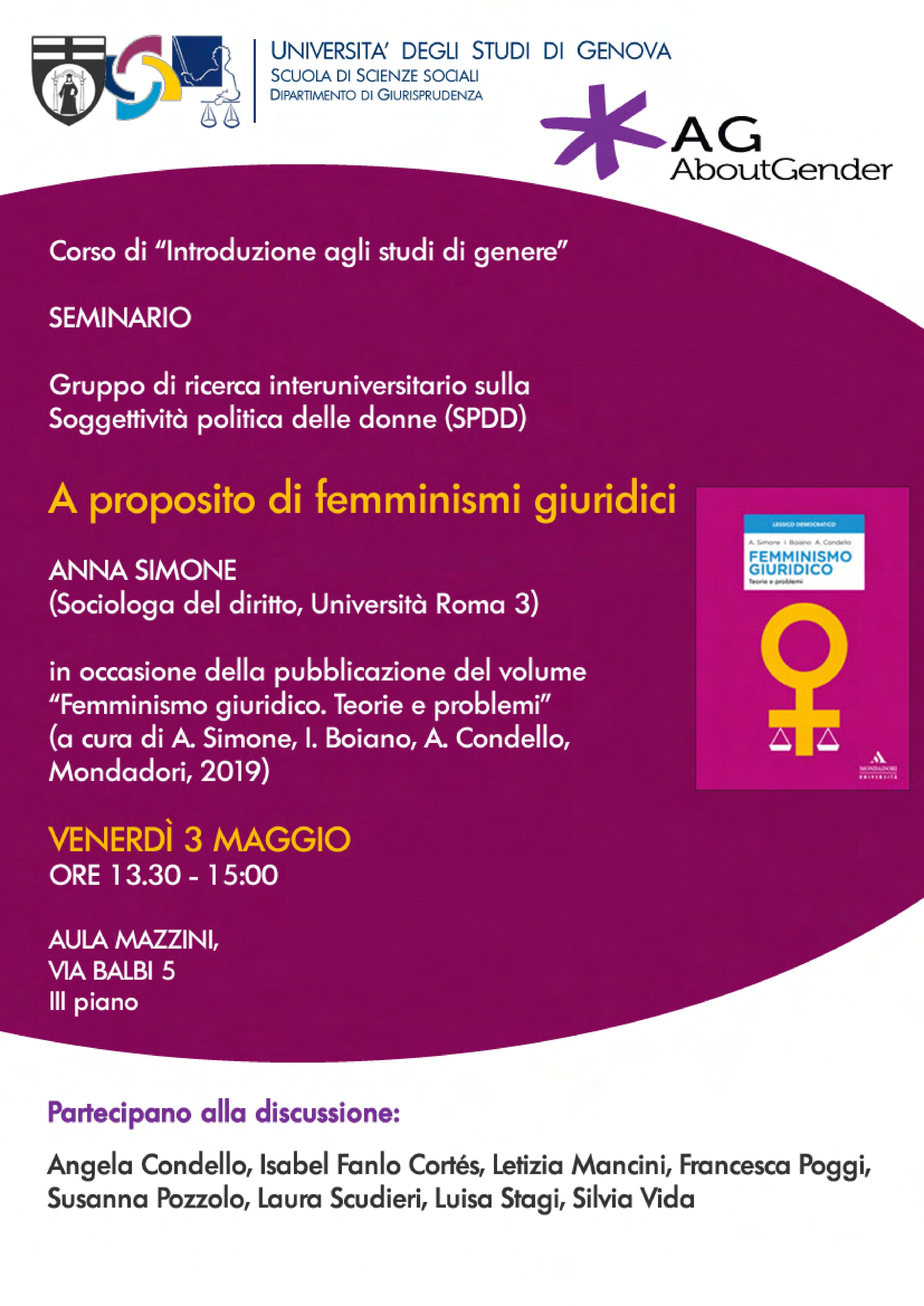 :: Events :: Il giorno venerdì 3 maggio si terrà, dalle ore 13.30, presso l’Università degli Studi di Genova (via Balbi 5), il seminario A proposito di femminismi giuridici. Il seminario sarà tenuto da Anna Simone (U. Roma Tre) e a discutere saranno, tra le altre, Isabel Fanlo Cortés, Francesca Poggi, Laura Scudieri e Susanna Pozzolo. Di seguito è consultabile la locandina del Seminario così come il programma del ciclo di seminari in cui si iscrive.