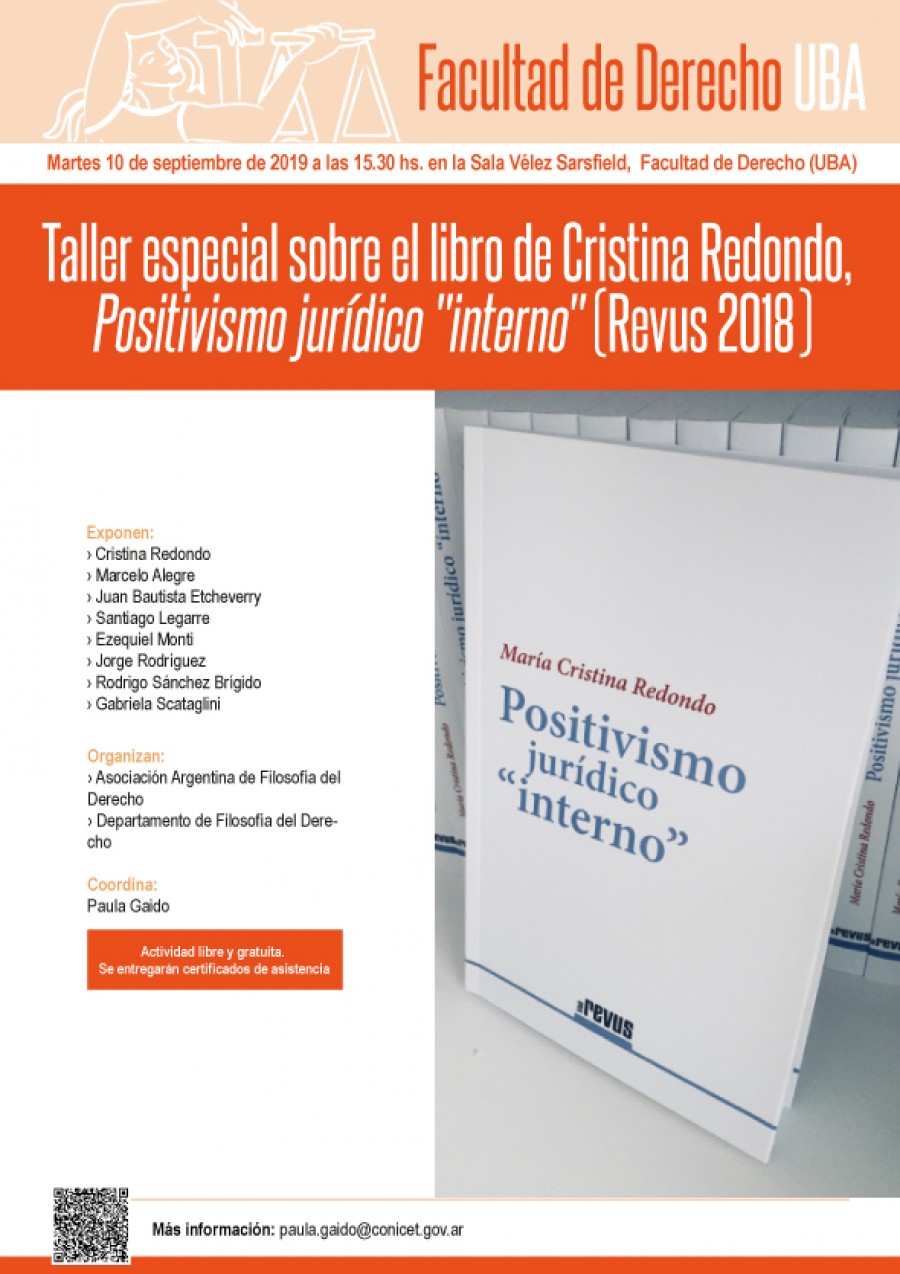 :: Events:: El próximo martes 10 de septiembre de 2019 a las 15.30 hs., en la Sala Vélez Sarsfield de la Facultad de Derecho – Universidad de Buenos Aires (Argentina), se llevará a cabo un taller especial sobre el libro de M. Cristina Redondo Natella, “Positivismo jurídico ‘interno’” (Klub Revus 2018). El taller contará con una exposición de la autora, entre otras exposiciones.