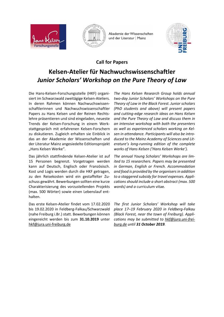 :: Calls :: The Hans Kelsen Research Group is soliciting applications from Junior scholars. The Junior Scholars’ Workshop on the Pure Theory of Law call for papers is open until the 31st October 2019, whereas the Kelsen Junior Guest Research Fellowship will be decided on 30th April and 31st October of each year. Along these lines you could find more information about the calls.