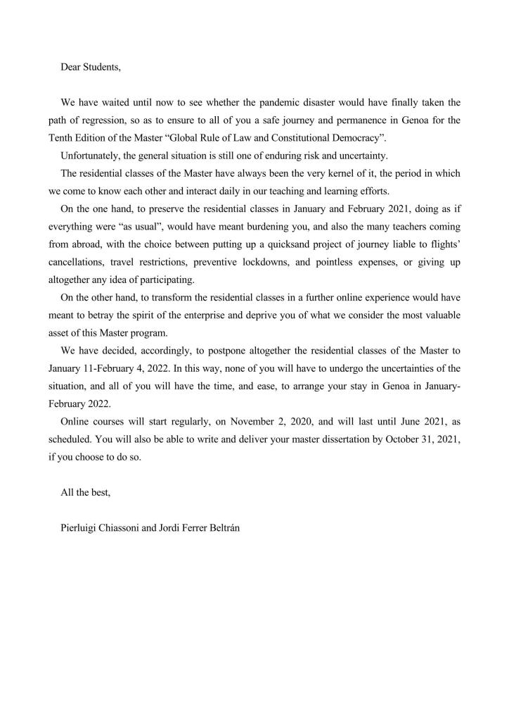 :: Master Global Rule of Law :: A causa de las persistentes dificultades relacionadas con la emergencia sanitaria producida por Covid-19 se ha decidido, para garantizar la seguridad de estudiantes y profesores, posponer los cursos presenciales a la próxima edición del máster. En las líneas que siguen pueden encontrar adjunta la carta de los directores del máster.