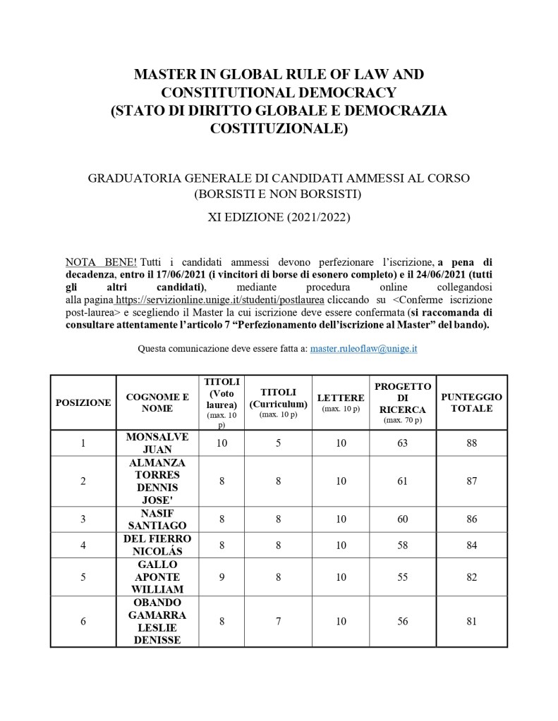 :: Master Global Rule of Law :: Acaba de publicarse la graduatoria general de las candidatas y candidatos admitidos a la XI Edición del Master in Global Rule of Law and Constitutional Democracy. En las líneas que siguen puede encontrarse la lista de los admitidos, tanto los beneficiarios como los no beneficiarios de beca.