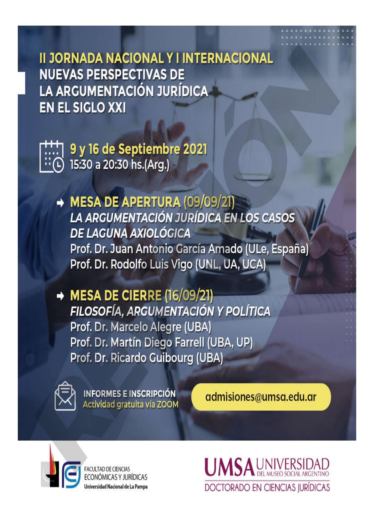 :: Events :: Los días jueves 9 y jueves 16 de septiembre entre las 15.30 y 20:30 hs (horario Argentina) se llevará a cabo la segunda edición de la jornada “Nuevas perspectivas de la argumentación jurídica en el siglo XXI”. Aquí puede encontrar información y el programa completo del evento.