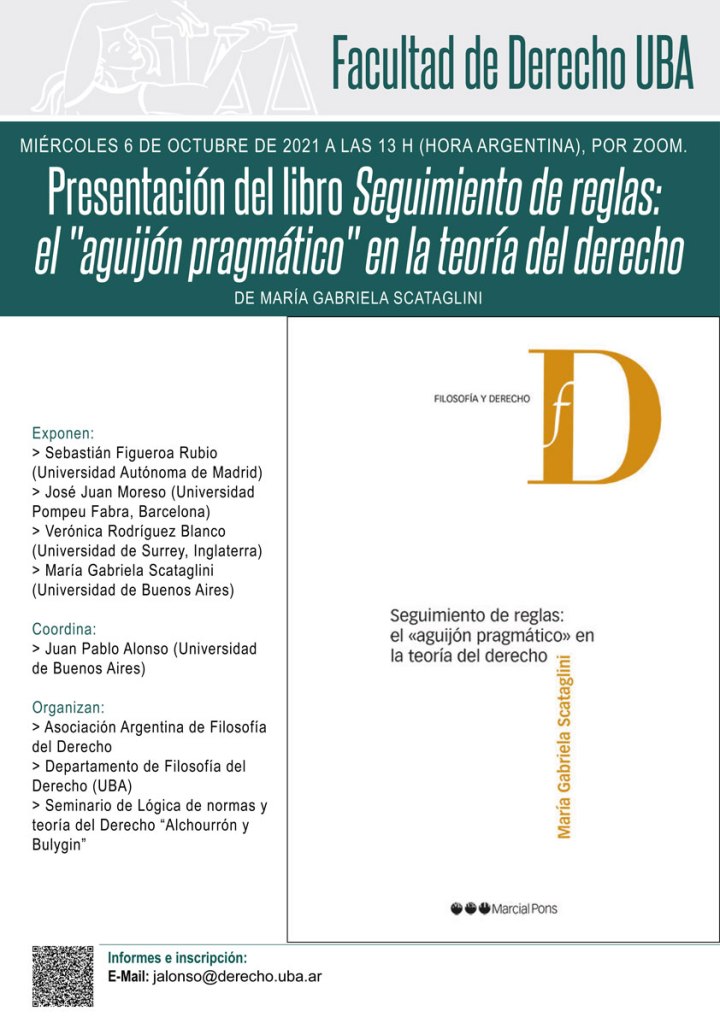 :: Book presentation :: El miércoles 6 de octubre a las 13:00 hrs. (UTC-3) se llevará a cabo, en plataforma Zoom, la presentación del libro M.G. Scataglini, Seguimiento de reglas: el “aguijón pragmático” en la teoría del derecho (Marcial Pons, 2021).