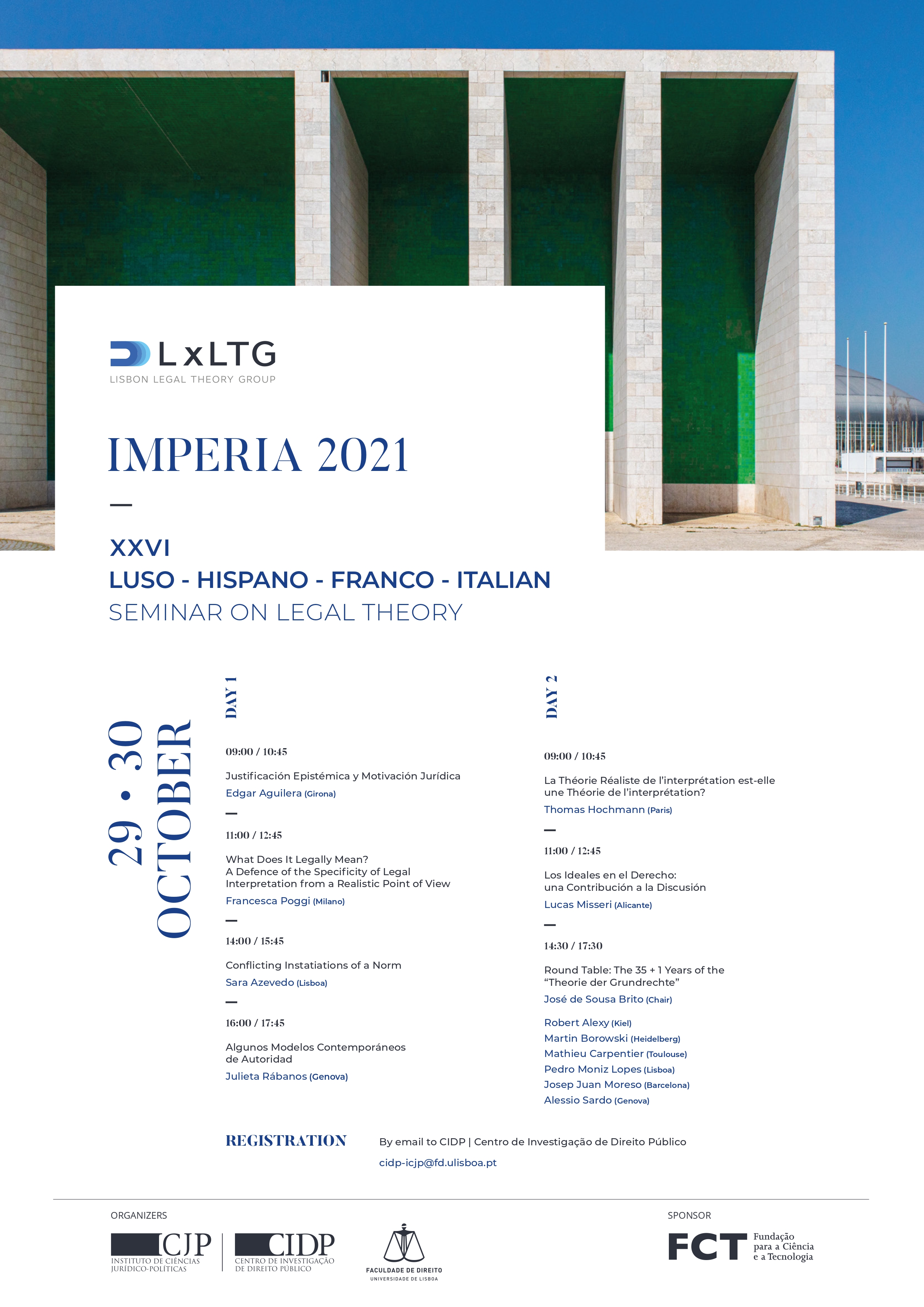 :: Events :: The 26th Luso-Hispano-Franco-Italian Seminar on Legal Theory will be held in Lisbon (Portugal) on 29-30 October 2021. The speakers are Edgar Aguilera (Girona), Francesca Poggi (Milano), Sara Azevedo (Lisbon), Julieta Rabanos (Genova), Thomas Hochmann (Paris) and Lucas Misseri (Alicante).