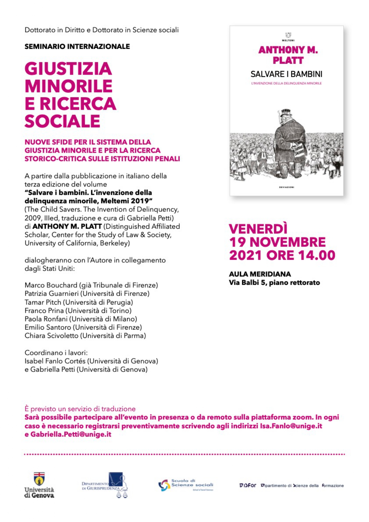 ::Events:: Venerdì 19 novembre alle 14, nell’aula della Meridiana dell’Università di Genova, si terrà il seminario internazionale su “Giustizia minorile e ricerca sociale. Nuove sfide per il sistema della giustizia minorile e per la ricerca storico-critica sulle istituzioni penali”, con la partecipazione di Anthony Platt (Distinguished Affiliated Scholar, Center for the Study of Law & Society, University of California, Berkley).