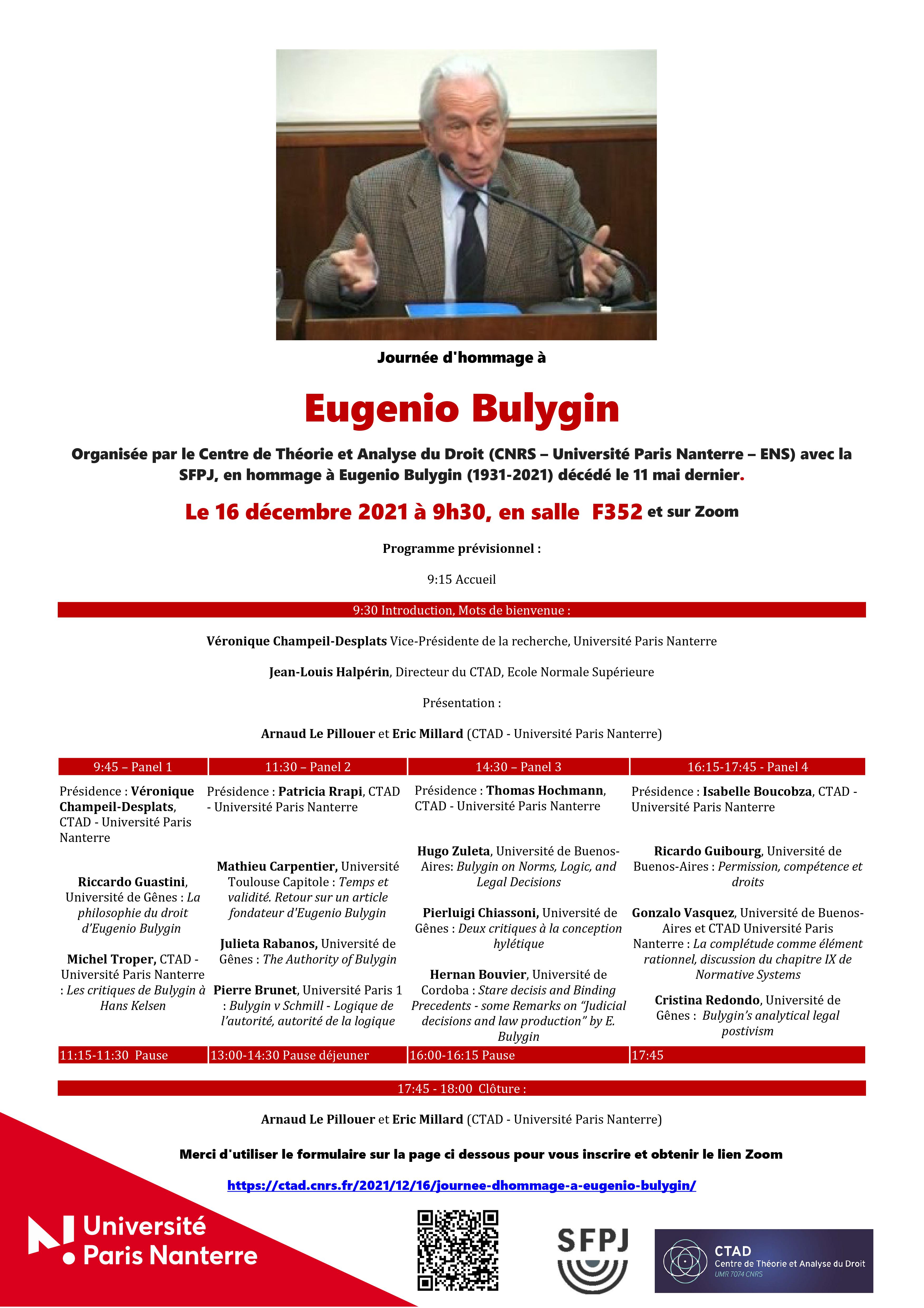 :: Events :: On 16 December, the “Symposium Tribute to Eugenio Bulygin” will take place. This symposium is organised by the Centre de Théorie et Analyse du Droit (CNRS – Université Paris Nanterre – ENS) together with the SFPJ to pay tribute to Eugenio Bulygin, who passed away on 11 March 2021.