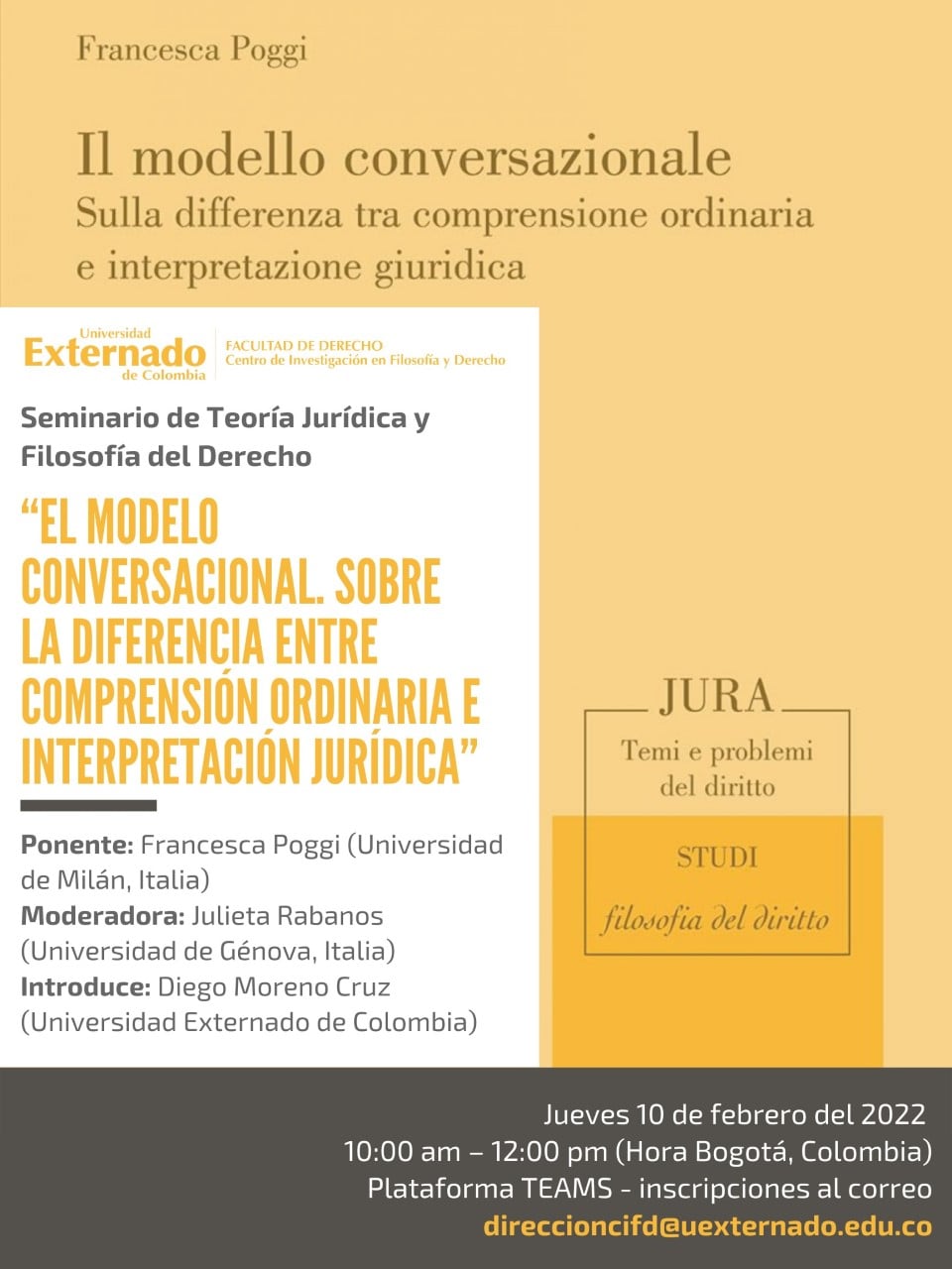 :: Events :: El próximo 10 de febrero, a las 10:00 hrs. (UTC-5), la profesora Francesca Poggi ofrecerá un seminario online sobre “El modelo conversacional. Sobre la diferencia entre comprensión ordinaria e interpretación jurídica”. La conferencia está organizada por el Centro de Investigación en Filosofía y Derecho de la Universidad Externado de Colombia.