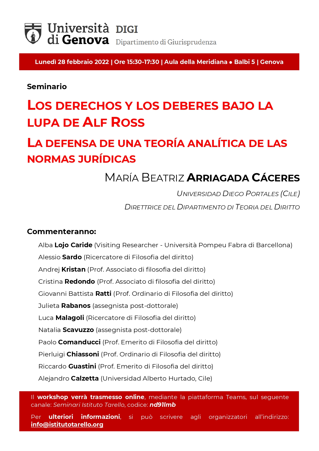 :: Events :: Il giorno 28 febbraio 2022, alle ore 15:30, nell’Aula della Meridiana dell’Università di Genova, la Prof. Dr. María Beatriz Arriagada Cáceres (Universidad Diego Portales, Cile – Direttrice del Dipartimento di Teoria del Diritto) terrà una relazione sul tema: “Los derechos y los deberes bajo la lupa de Alf Ross. La defensa de una teoría analítica de las normas jurídicas“.