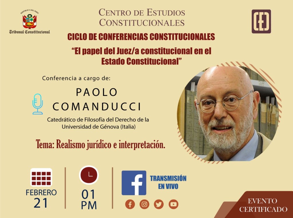 :: Events :: El Tribunal constitucional de la República del Perú organiza un ciclo de conferencias sobre el papel del juez constitucional en el Estado constitucional. El día 21 de febrero a las 13 hrs (horario peruano) tendrà lugar una conferencia del ciclo a cargo de Paolo Comanducci (Génova) sobre el relasimo jurídico e interpretación. La transmisión en vivo podrá seguirse desde la página Facebook del Tribunal: https://www.facebook.com/tribunalconstitucionalperu.