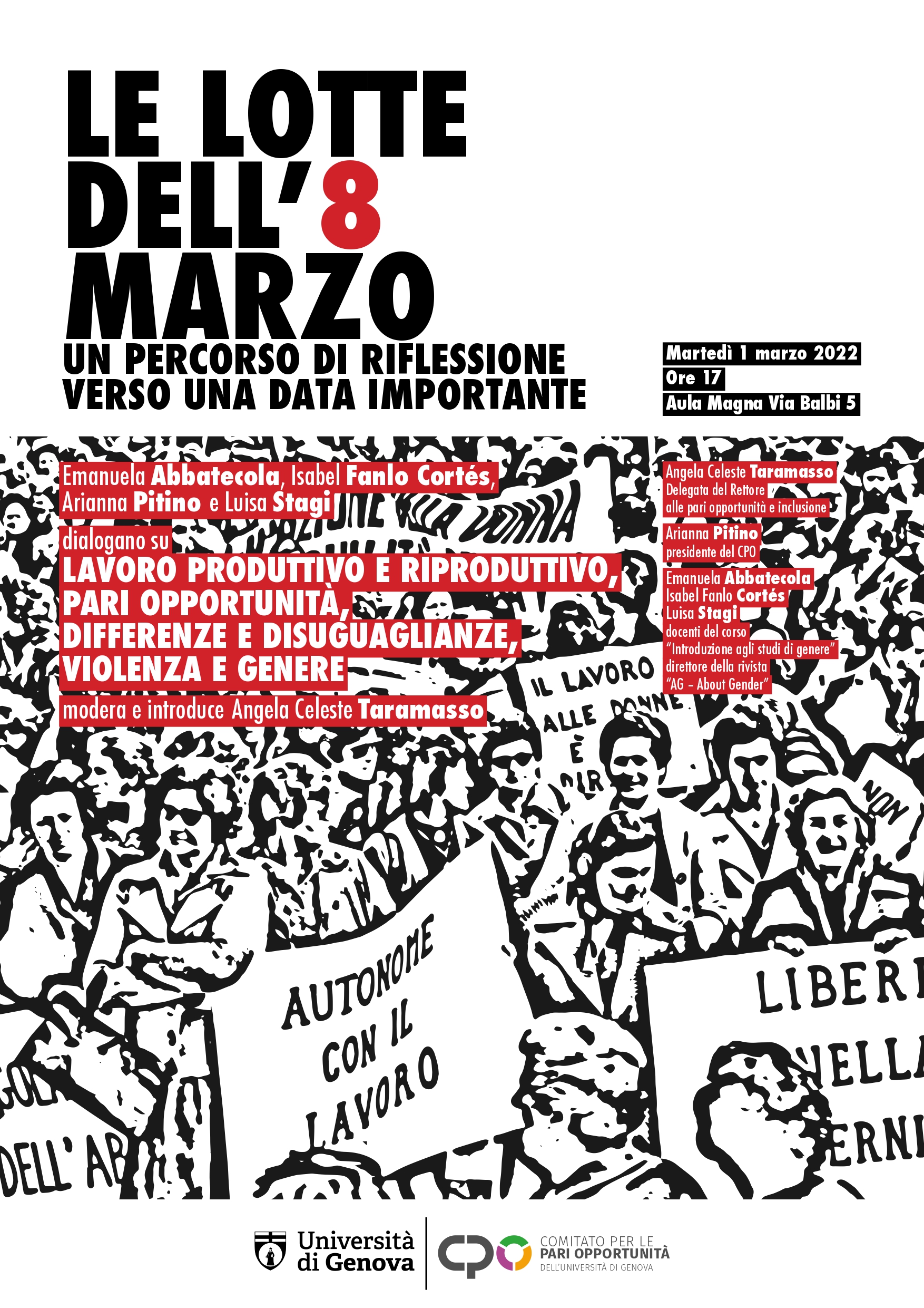 :: Events :: Il giorno 1 maggio 2022, alle ore 17, nell’Aula Magna Via Balbi 5, si terrà la lezione aperta «Le lotte dell’8 marzo. Un percorso di riflessione verso una data importante», in cui Emanuela Abbatecola, Isabel Fanlo Cortés, Arianna Pitino e Luisa Stagi dialogheranno su lavoro produttivo e riproduttivo, pari opportunità, differenze e disuguaglianze, violenza e genere. Modera e introduce: Angela Celeste Taramasso.