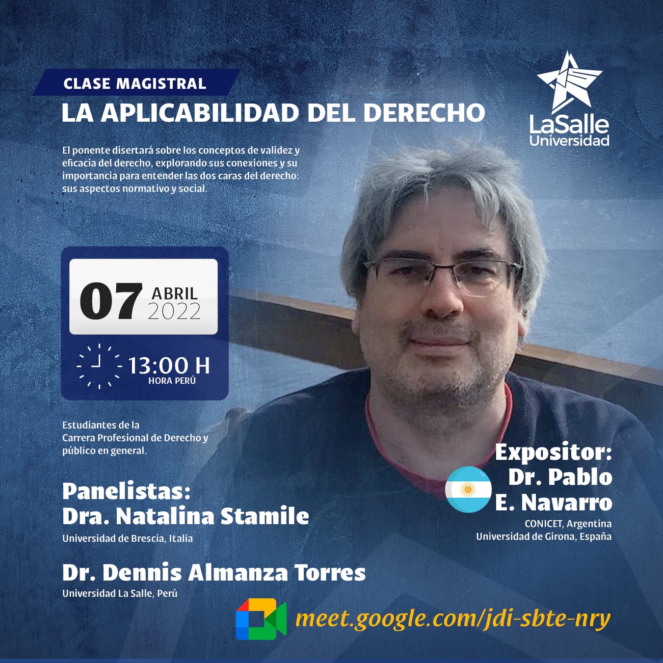 :: Events :: El próximo jueves 7 de abril, a las 13 horas del Perú, tendrá lugar la clase magistral titulada “La aplicabilidad del derecho”, a cargo del profesor Pablo Navarro (CONICET, Universidad de Girona). Asimismo, participarán como panelistas Natalina Stamile (Universidad de Brescia) y Dennis Almaza Torres (Universidad La Selle).