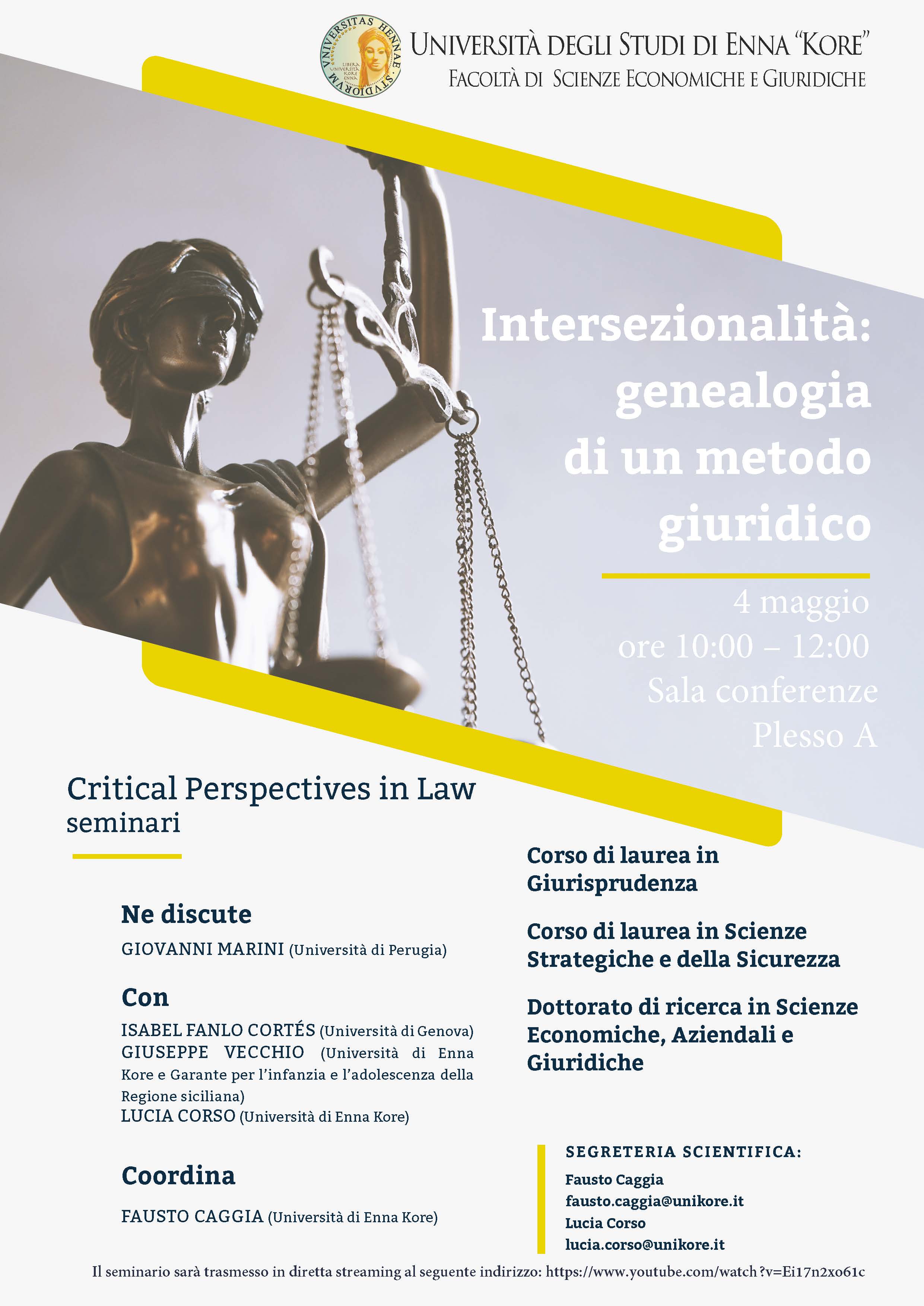 :: Events :: Mercoledì 4 maggio, alle ore 10, si terrà presso l’Università degli Studi di Enna Kore (Facoltà di Scienze Economiche e Giuridiche) il seminario Intersezionalità: genealogia di un metodo giuridico.