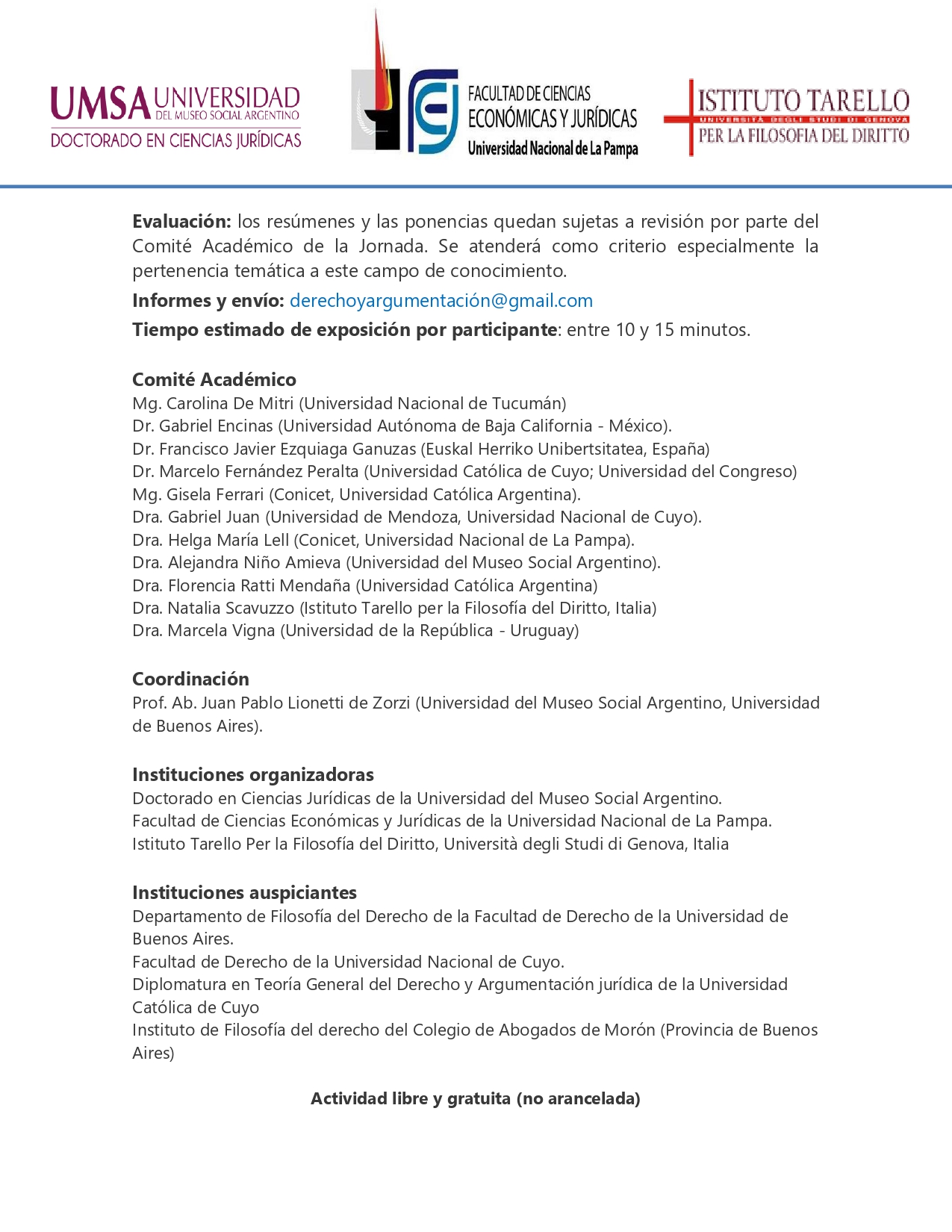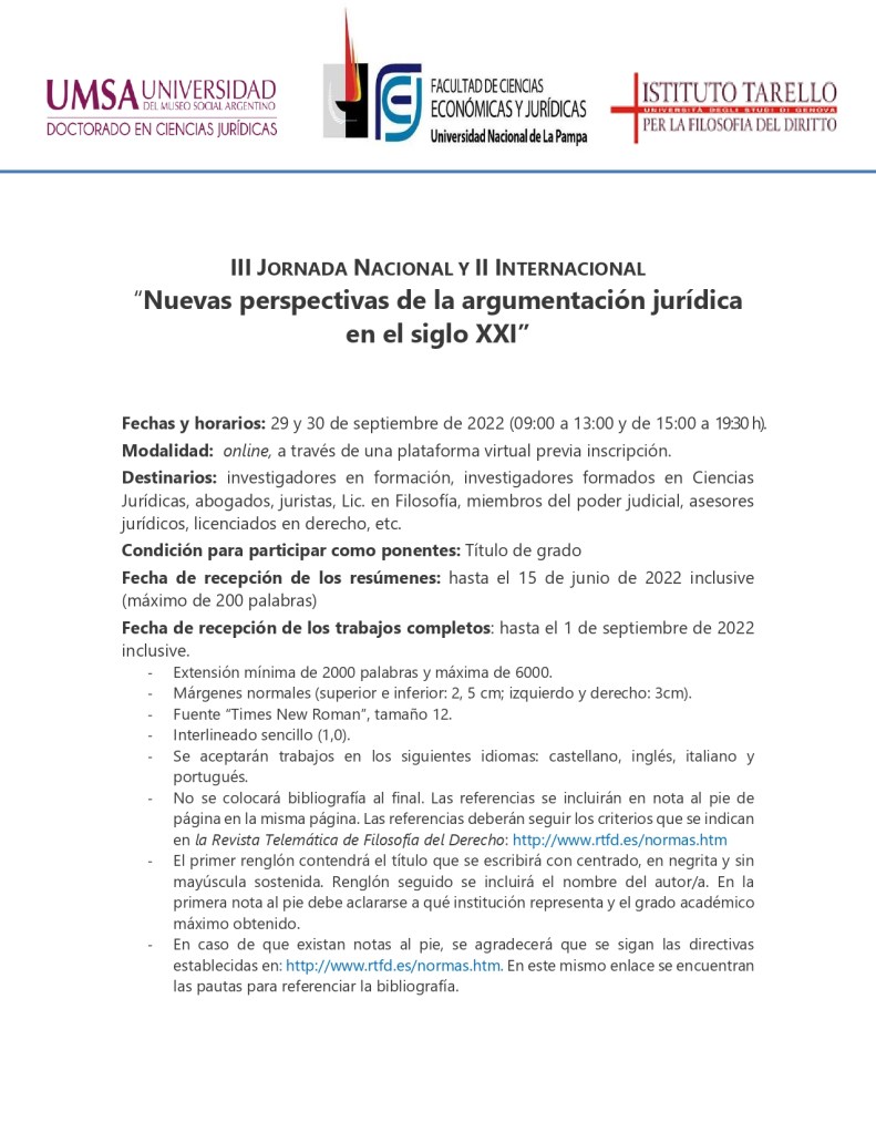 :: Call :: Se encuentra abierta la convocatoria para enviar contribuciones y participar en la III edición de las jornadas “Nuevas perspectivas de la argumentación jurídica en el siglo XXI”, que tendrán lugar los días 29 y 30 de septiembre, organizadas por Doctorado en Ciencias Jurídicas de la Universidad el Museo Social Argentino, Facultad de Ciencias Económicas y Jurídicas de la Universidad Nacional de la Pampa, Argentina, y el Instituto Tarello.