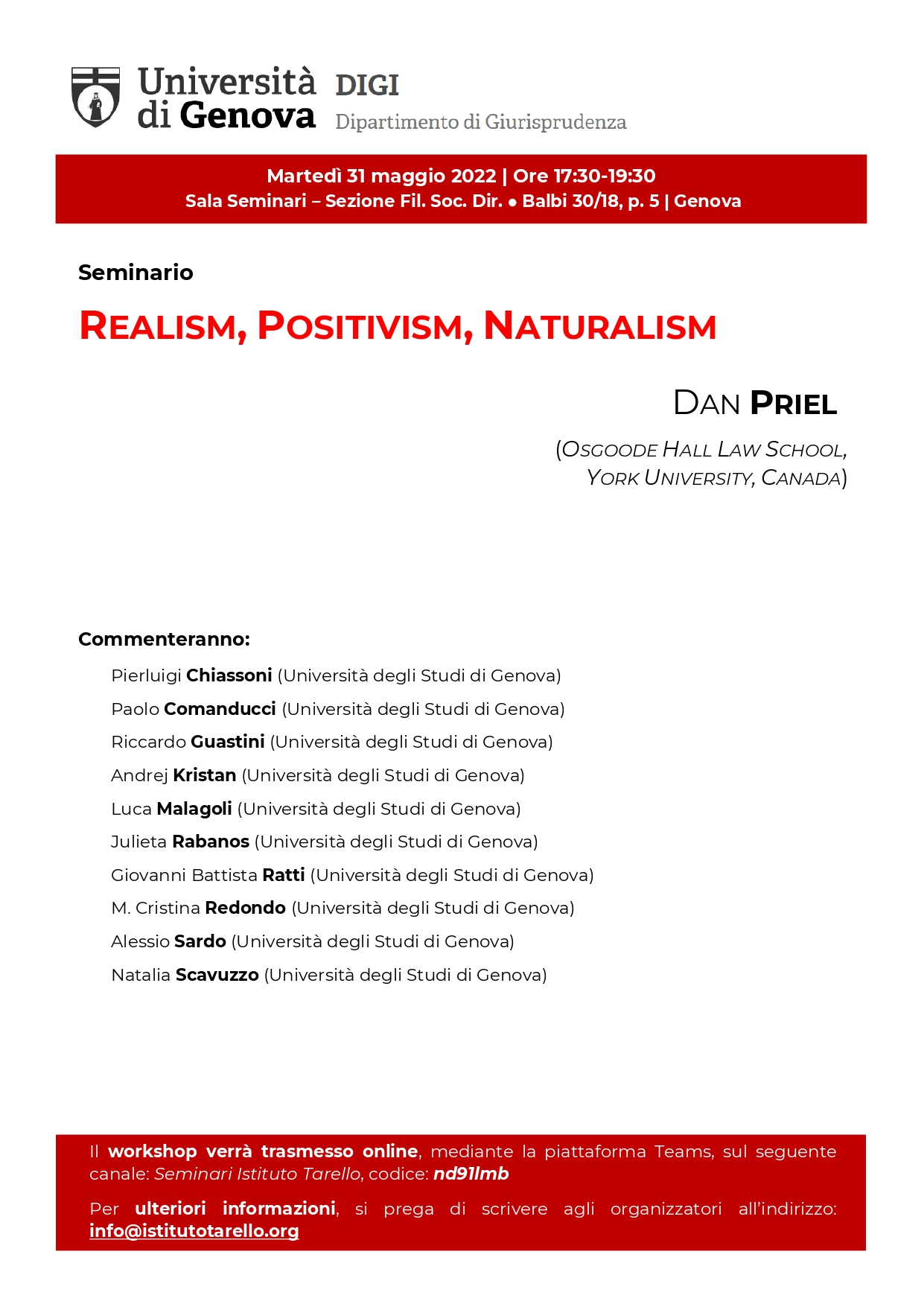 :: Events :: On Tuesday 31 May (17:30-19:30), Dan Priel (Osgoode Hall Law School, York University, Canada) will give a seminar on “Realism, Positivism, Naturalism” in the Sala Seminari of the Sezione Filosofia e Sociologia del Diritto (via Balbi 30/18 – Genova, Italy).