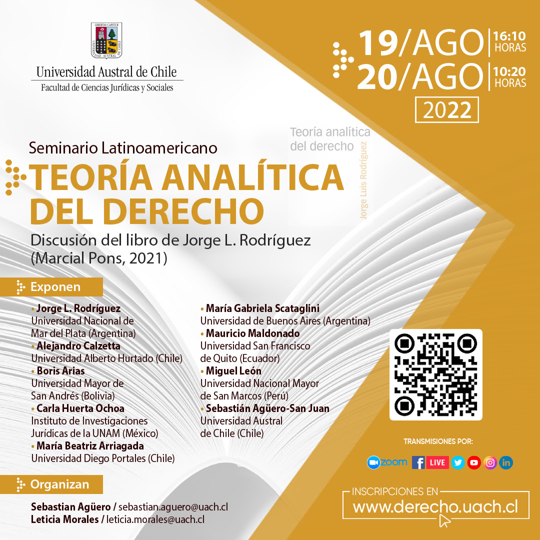 :: Events :: Los días 19 y 20 de agosto se realizará el Seminario Latinoamericano sobre Teoría Analítica del Derecho, organizado por la Facultad de Ciencias Jurídicas y Sociales de la Universidad Autral de Chile, en el que se discutirá el libro Teoría analítica del derecho (2021, Marcial Pons), del profesor Jorge L. Rodríguez.