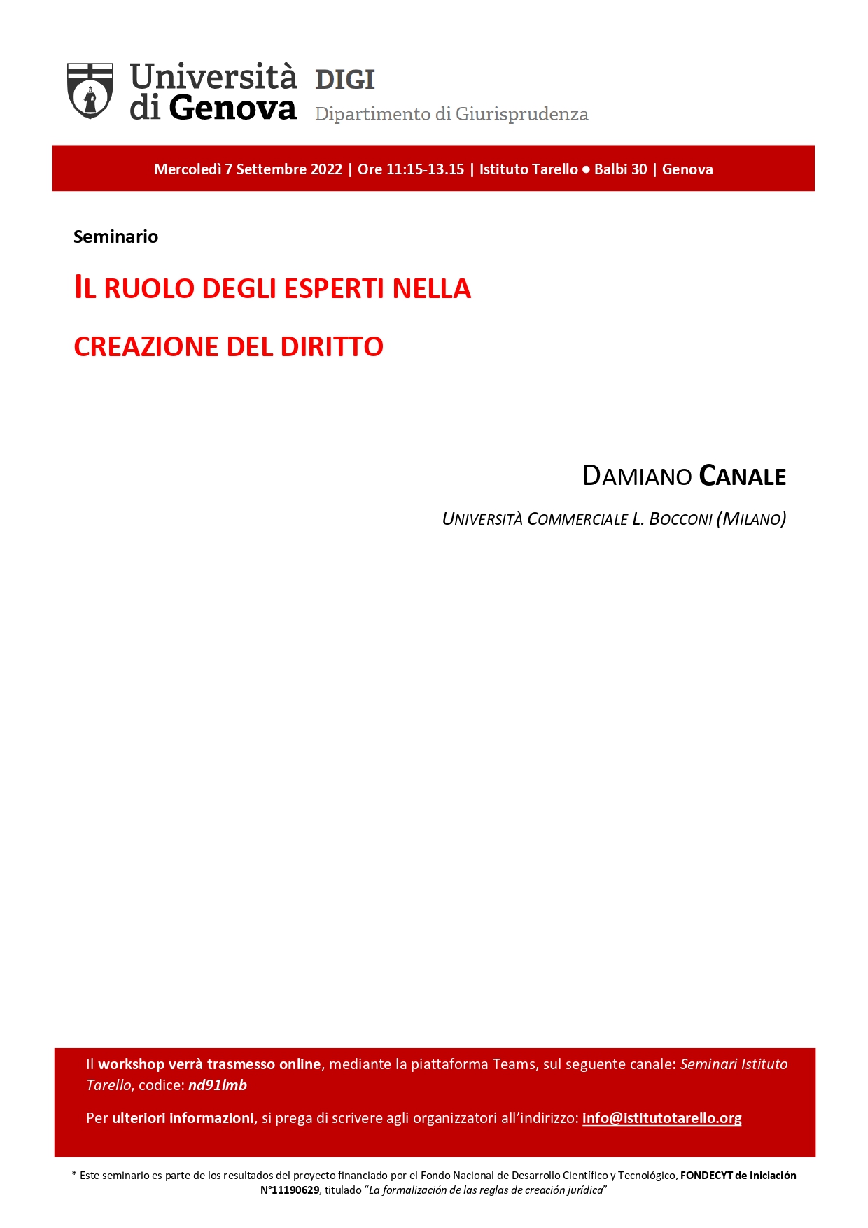 :: Events :: Il prossimo 07 di settembre, alle 11:15 presso all’Istituto Tarello (Balbi 30) si terrà il seminario “Il ruolo degli esperti nella creazione del diritto” a cura del professore Damiano Canale (Università Commerciale L. Bocconi di Milano), organizzato dal Dipartimento di Giurisprudenza dell’Università di Genova.