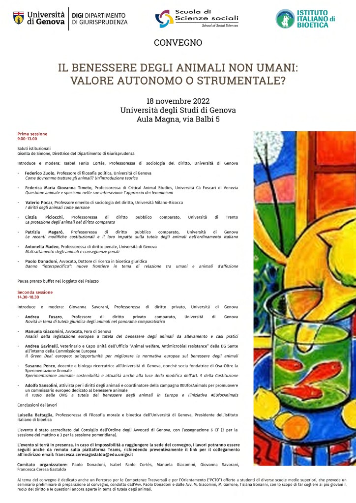 :: Eventi :: Venerdì 18 novembre, dalle ore 9, nell’Aula Magna dell’Università di Genova (Via Balbi 5, I piano), avrà luogo il convegno intitolato “Il benessere degli animali non umani: valore autonomo o strumentale?”.