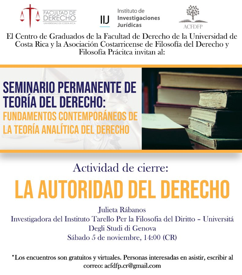 :: Events :: El próximo 5 de noviembre, a las 14:00 hrs (CST – Costa Rica), Julieta A. Rabanos (Universidad de Génova) ofrecerá un seminario online acerca de “La autoridad del derecho”.
