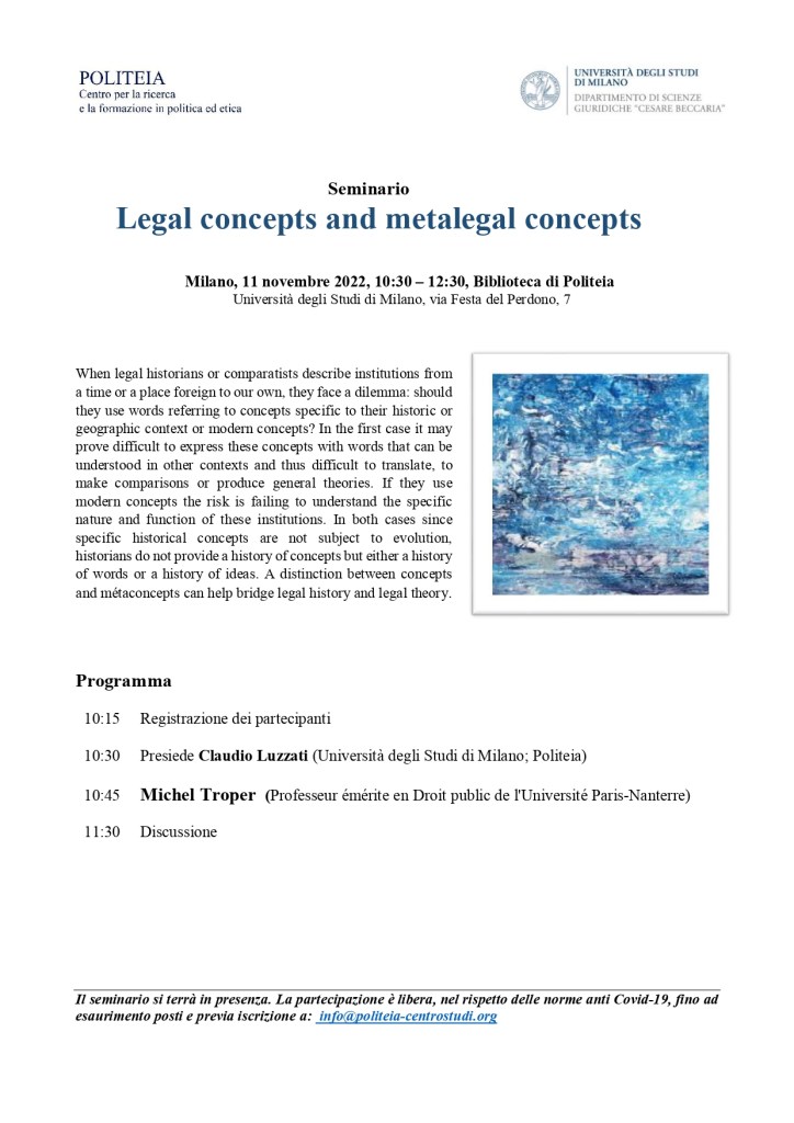 :: Eventi :: Il 11 novembre 2022, alle ore 10:30, nella Biblioteca di Politeia (via Festa del Perdono, 7 – Università degli Studi di Milano), si terrà il Seminario titulato “Legal concepts and metalegal concepts” a cura dei professori Claudio Luzzati (Università degli Studi di Milano) e Michel Tropper (Professeur émérite en Droit public de l’Université Paris-Nanterre).