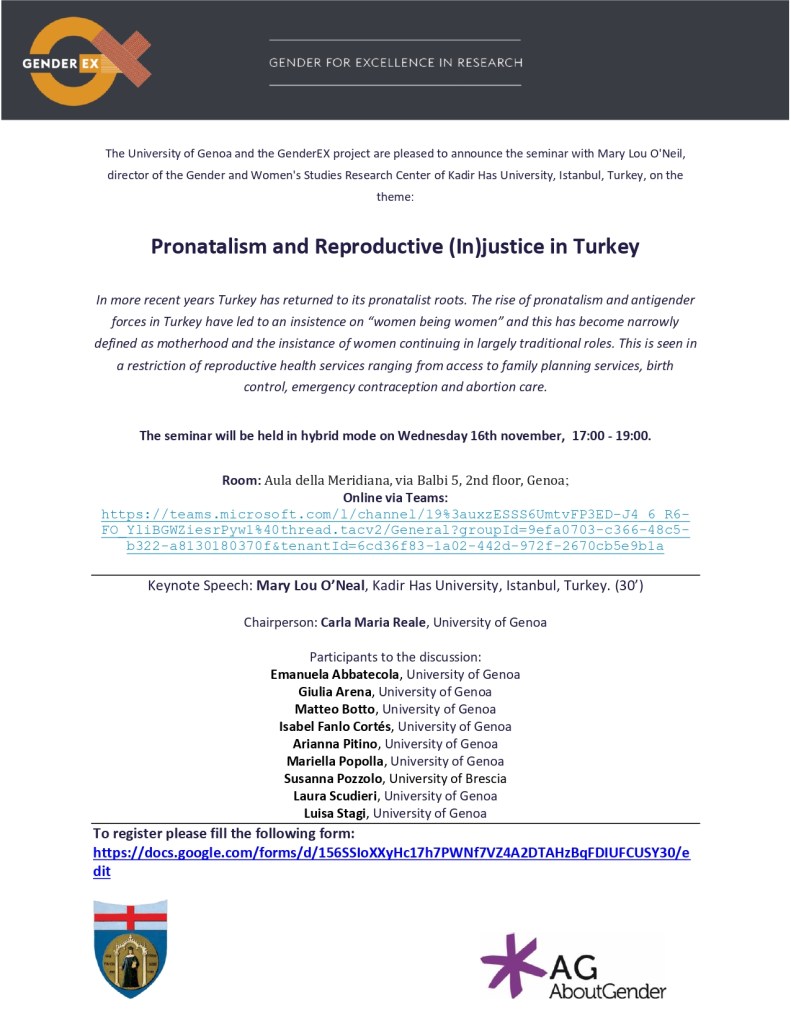 :: Events:: On November 16th will be held at the University of Genoa the seminar “Pronatalism and Reproductive (In)justice in Turkey” with Mary Lou O’Neil, director of the Gender and Women’s Studies Research Center of Kadir Has University, Istanbul, Turkey.