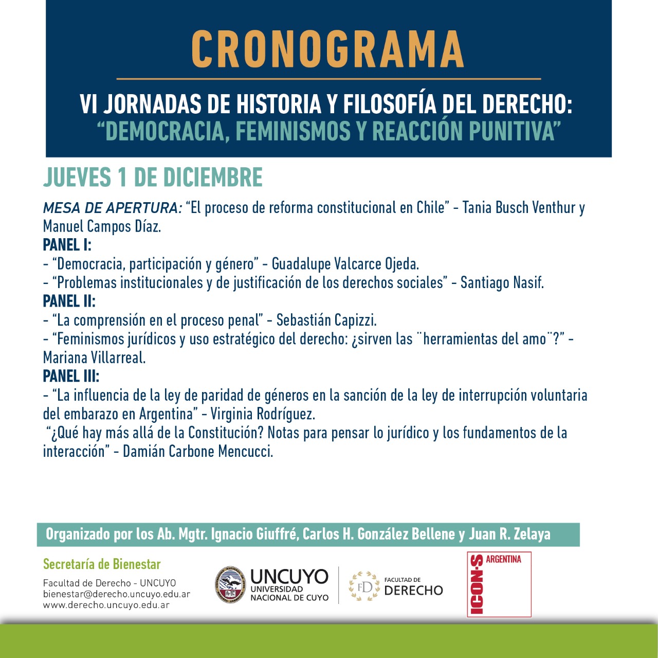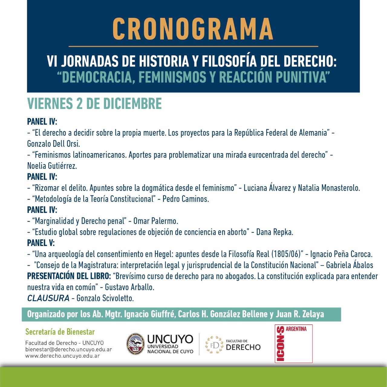 El próximo 1 y 2 de diciembre se llevarán a cabo las VI Jornadas de Historia y Filosofía del Derecho en la Facultad de Derecho de la Universidad Nacional de Cuyo (Argentina). En esta sexta edición de las Jornadas de Historia y Filosofía del Derecho ha de reflexionarse sobre los fundamentos del Estado Constitucional, la teoría de la democracia y los límites de la criminalización de conductas, atravesado por una perspectiva crítica feminista. Se abordará tanto la situación y desafíos actuales sobre estos asuntos, así como también los aportes y límites de propuestas normativas.