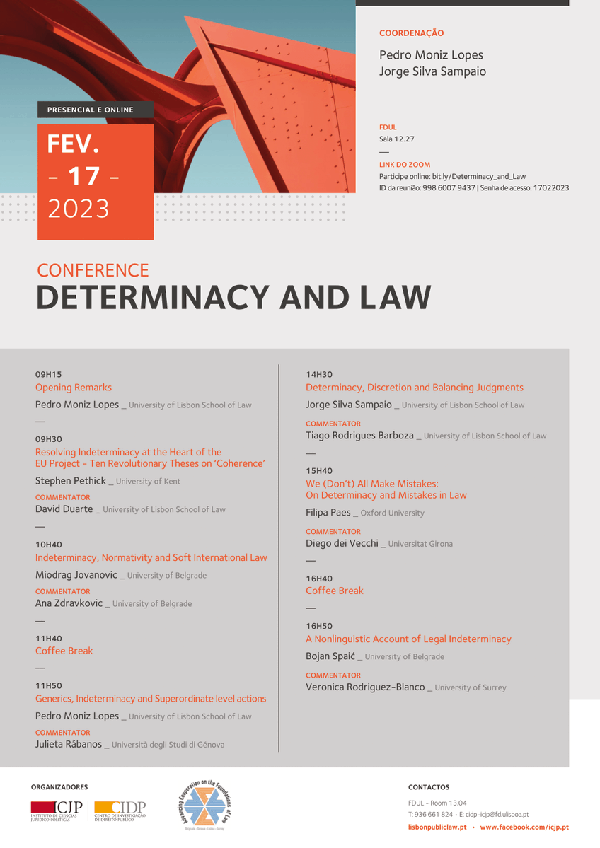 ::Conference:: On February 17 in Sala 12.27 of the Faculty of Law of the University of Lisboa the conference Determinacy and Law will take place. This is a hybrid conference organised under the auspices of ALF initiative (Belgrade – Genova – Lisboa – Surrey).