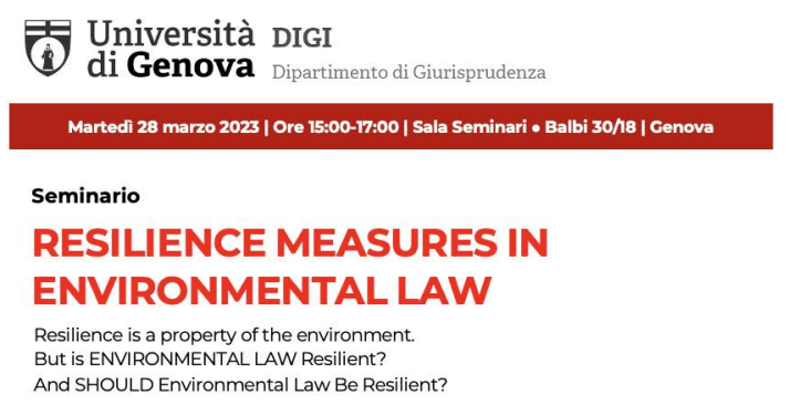 :: Event, Seminar :: On March 28 Prof. Ievgeniia Kopytsia (UniGe, Yaroslav Mudryi National Law University) will lead the seminar Resilience Measures in Environmental Law. The seminar will take place at the Sala Seminari of Via Balbi 30/18, Genova from 15:00 to 17:00.