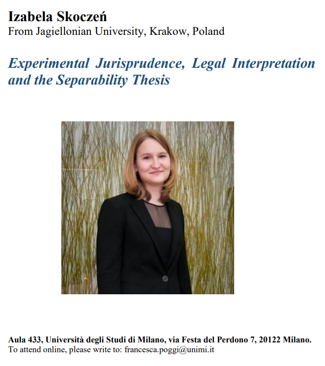 :: Event :: On July 17, Izabela Skoczeń (Jagiellonian) will present the conference entitled Experimental Jurisprudence, Legal Interpretation and the Separability Thesis will take place in the Aula 433 of the Università degli studi di Milano (via Festa del Perdono 7, 20122 Milano).