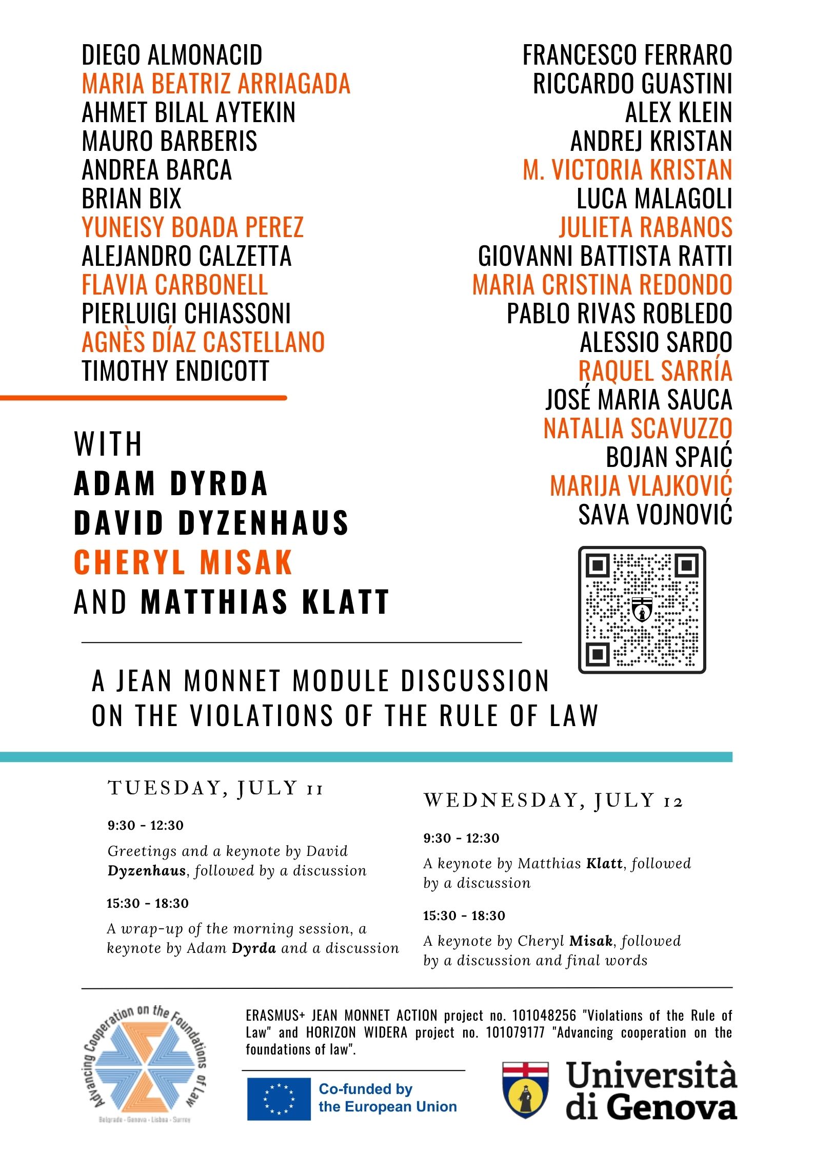 The event is connected with the HORIZON-WIDERA ALF project (Advancing cooperation on the foundations of law) and integrated in the 12th edition of the international master’s course in Global Rule of Law and Constitutional Democracy offered by the University of Genoa in Italy and the University of Girona in Spain.