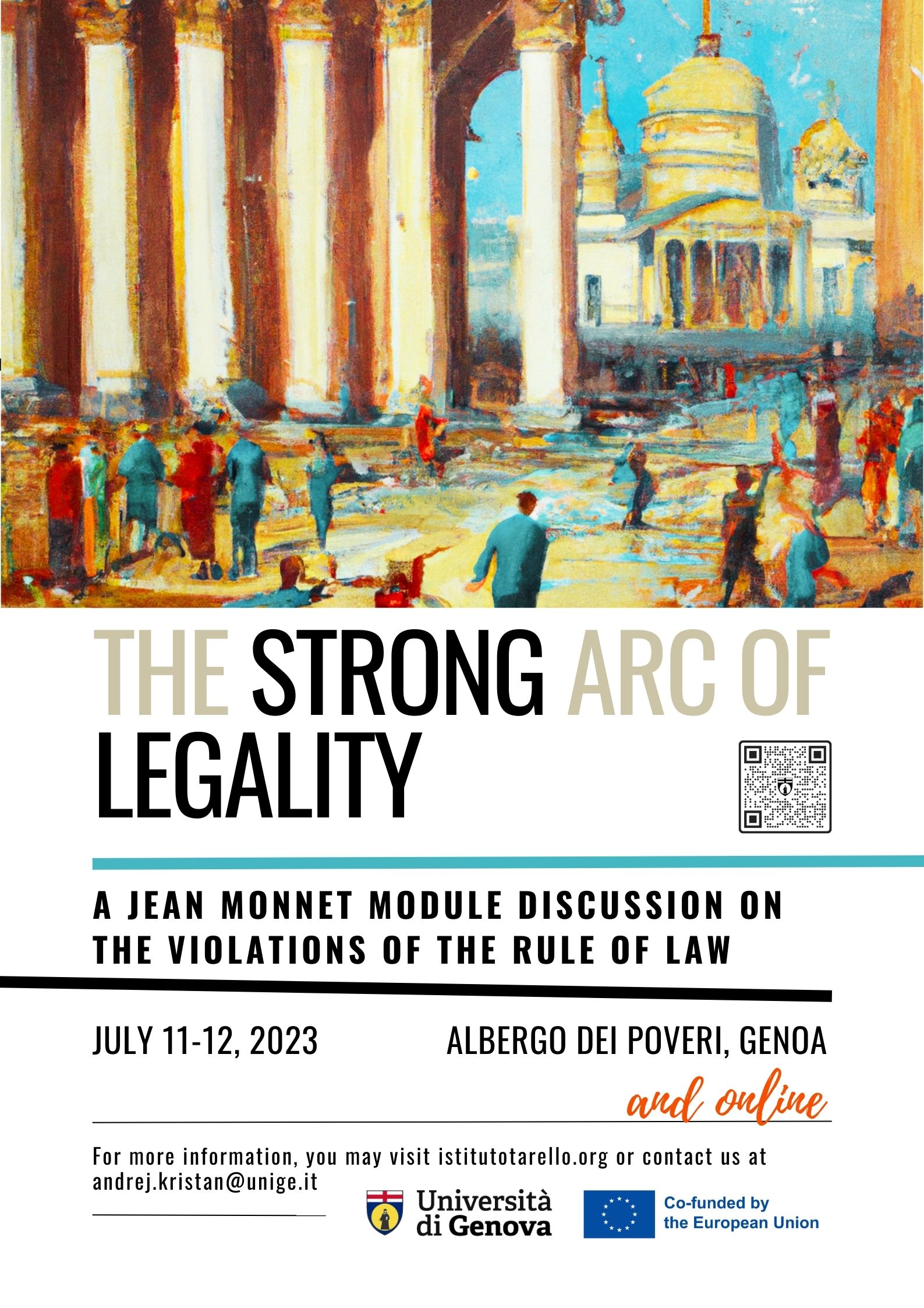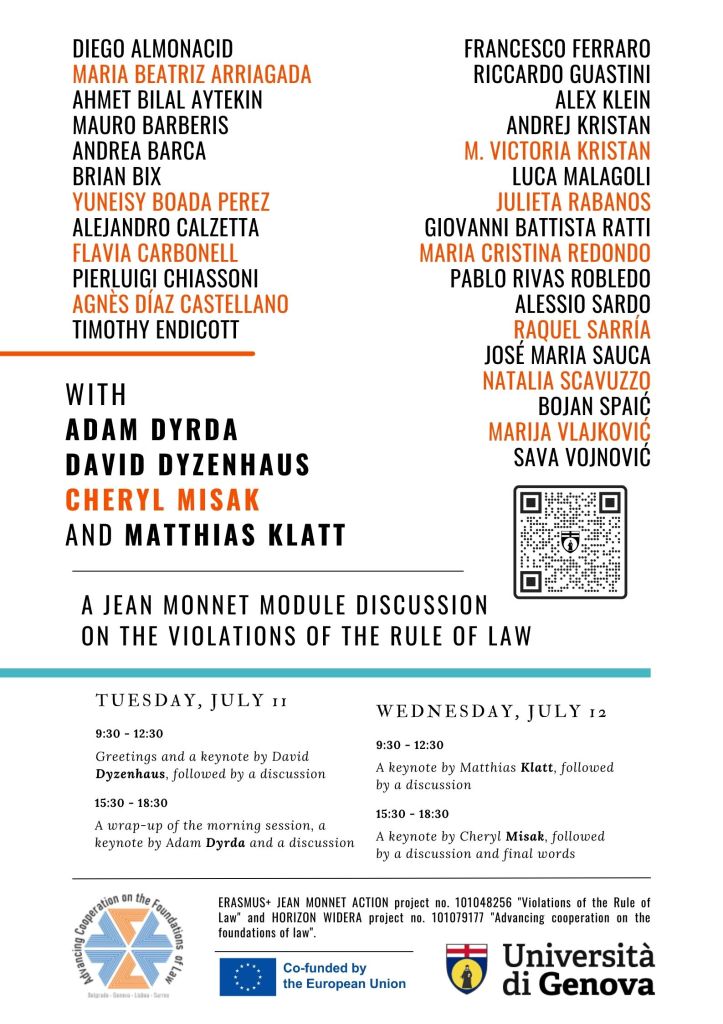 :: Event :: The second Jean Monnet module discussion on the violations of the Rule of Law will take place at the Palazzo dell’Albergo dei Poveri in Genoa during two morning and two afternoon sessions on July 11 and July 12, 2023. The event includes four keynotes by Adam Dyrda, David Dyzenhaus, Cheryl Misak and Matthias Klatt, followed by discussions with prominent international guests and several members of the Tarello Institute for Legal Philosophy at the University of Genoa (see page 2 of the event poster below). It will be conducted both in-person and online.