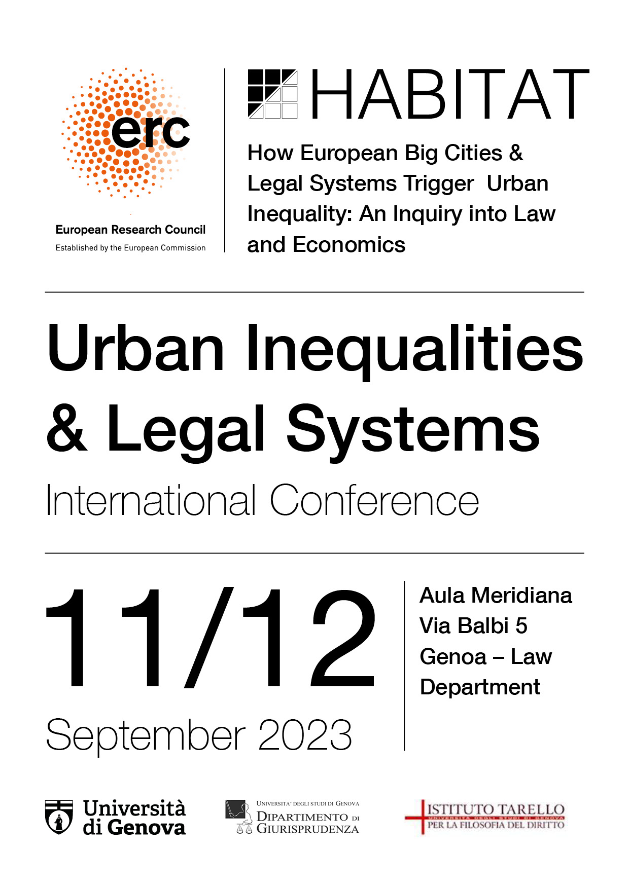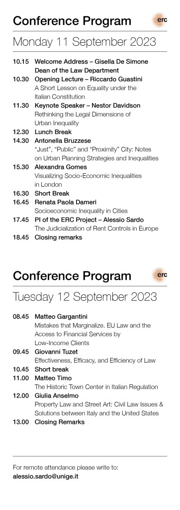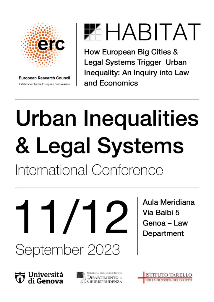Join us at the University of Genoa for the European Research Council (ERC) STG #HABITAT 1st International Conference “Urban Inequalities and Legal Systems” on September 11th an 12th (Aula Meridiana, Law Department, Via Balbi 5, Genoa). Check out the conference brochure for the programme. For remote attendance, please write to: alessio.sardo@unige.it