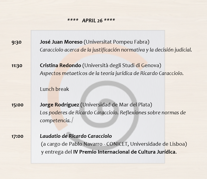 Para dotar la entrega del Premio de un cariz eminentemente académico, las jornadas contarán con ponencias de seis investigadores que expondrán en torno a la obra de Ricardo Caracciolo y sus cruciales aportaciones en la cultura jurídica, así como una ponencia del propio premiado.