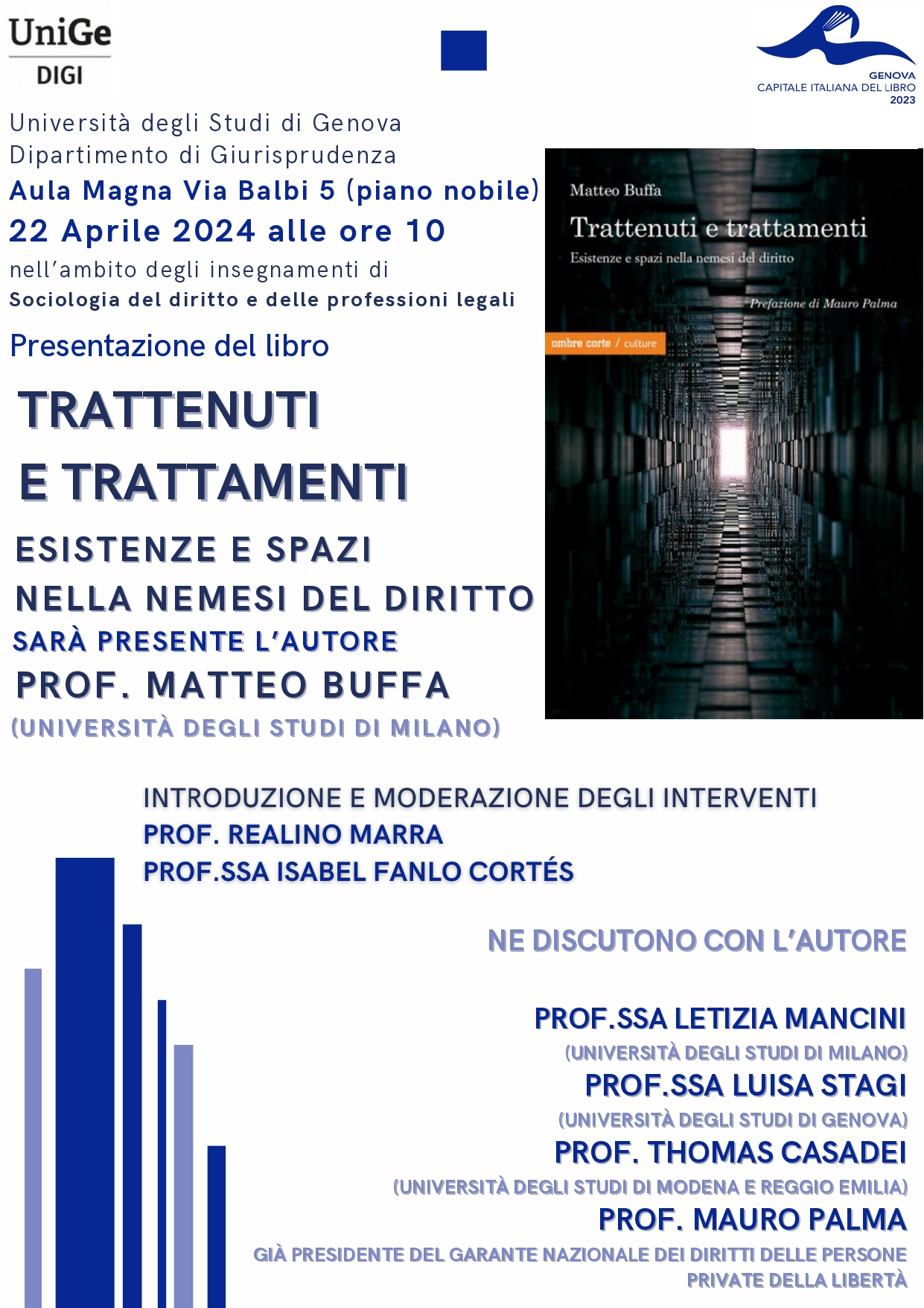 :: Eventi :: Lunedì 22 Aprile, dalle ore 10, presso l’Aula Magna del dipartimento di Giurisprudenza dell’Università di Genova (via Balbi 5) si terrà la presentazione del libro “Trattenuti e trattamenti. Esistenze e spazi nella nemesi del diritto” del Prof. Matteo Buffa dell’Università degli Studi di Milano.