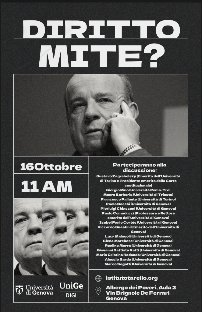 Il giorno 16 ottobre 2025, alle ore 11, presso l’Aula 2 dell’Albergo dei Poveri ( Piazzale Emanuele Brignole 2, Genova) avrà luogo il seminario Diritto mite? Discutendo con Gustavo Zagrebelsky (trent’anni dopo).