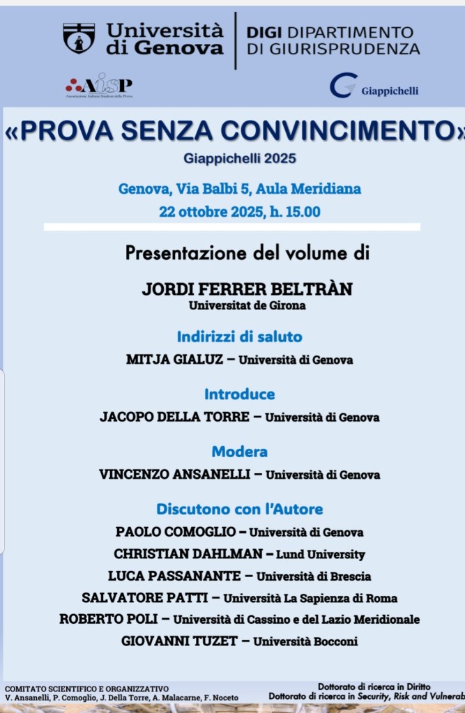 Il giorno 22 ottobre 2025, alle ore 15, presso l’Aula Meridiana ( Via Balbi 5, Genova) avrà luogo il presentazione del volume “Prova senza convincimento” di Jordi Ferrer Beltràn.