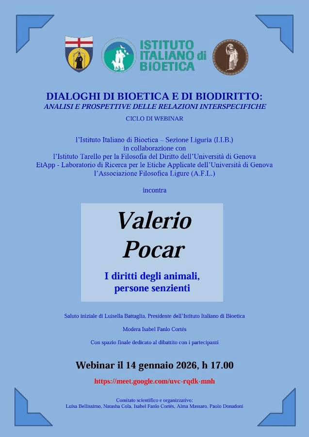I DIRITTI DEGLI ANIMALI, PERSONE SENZIENTI: è il titolo dell’incontro on line con Valerio Pocar che si tiene mercoledì 14 gennaio 2026 alle ore 17:00, primo incontro del ciclo di webinar che si terranno fino a maggio organizzati dall’Istituto Italiano di Bioetica in preparazione del Convegno online che si svolgerà sabato 23 maggio 2026 h 17.00, *I diritti degli animali: quarant’anni dopo* (nell’anniversario del Convegno del 23 maggio 1986, il primo in Italia sui diritti degli animali, curato da Silvana Castignone e Luisella Battaglia).