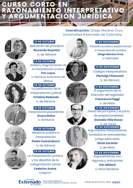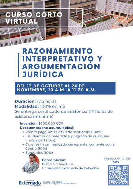 La Universidad del Externado de Colombia presenta el curso corto virtual de «Razonamiento interpretativo y argumentación jurídica». El curso está dirigido a profesionales y estudiantes que busquen profundizar sus conocimientos en el repertorio de técnicas y habilidades interpretativas y analíticas para todos los juristas y operadores jurídicos: estudiantes de derecho, abogados litigantes, fiscales, funcionarios y jueces en su labor profesional. Cada una de las sesiones será impartida por docentes expertos, nacionales e internacionales, con amplia trayectoria profesional y académica. Se desarrollará en la modalidad 100% online, con una duración de 17.5 horas de clase, las cuales se impartirán en 12 sesiones, distribuidas entre el 13 de octubre y el 24 de noviembre del año en curso. Se otorgará certificado de participación, emitido por la Universidad Externado de Colombia, con 14 horas de asistencia mínima.